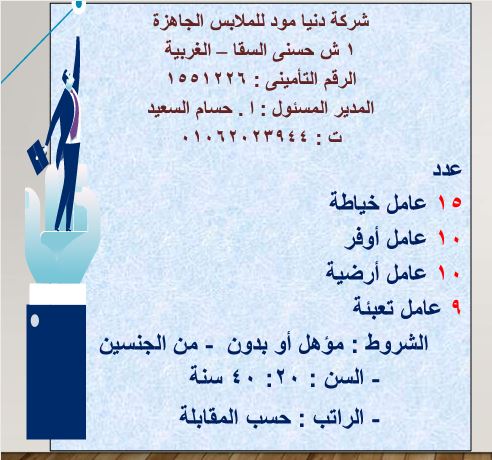 أعلنت شركة دنيا مود للملابس الجاهزة، عن وجود 44 فرصة عمل للشباب، وكانت الوظائف المطلوبة على النحو التالي: