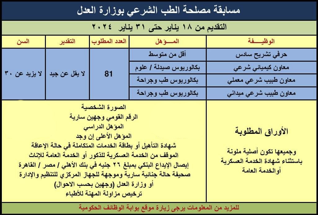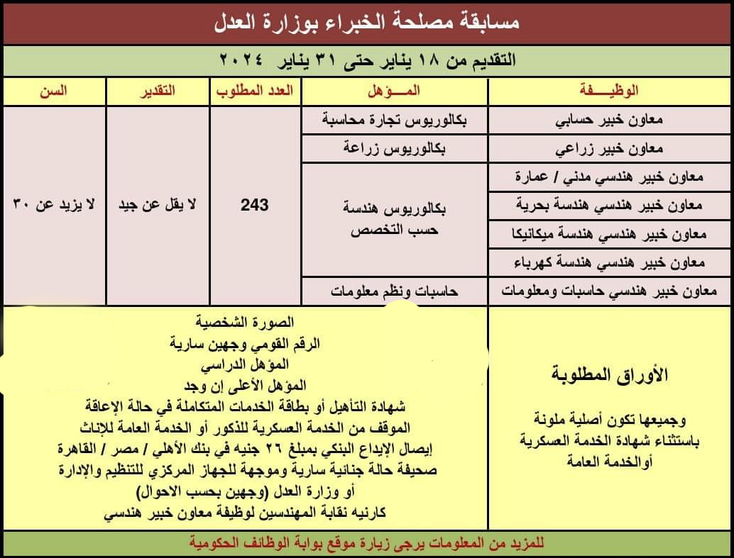 أعلنت مصلحة الخبراء بوزارة العدل عن حاجتها لعدد من الوظائف الحكومية بعدة قطاعات مختلفة، لحملة المؤهلات العليا والمتوسطة وبدون مؤهلات، وكانت الوظائف المعلن عنها بوزارة العدل علي النحو التالي: