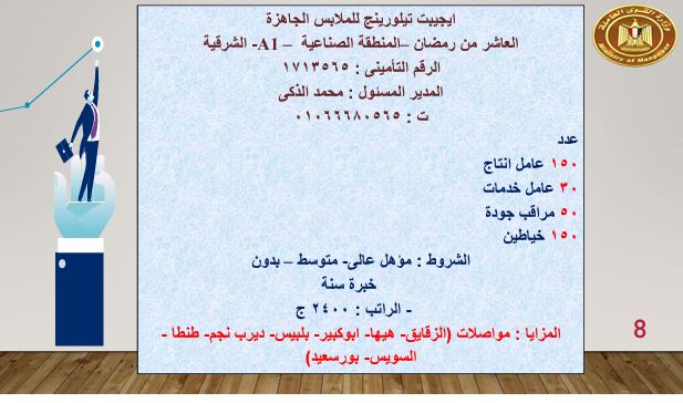 أعلنت شركة ايجيبت تيلورينج للملابس الجاهزة، عن وجود 380 فرصة عمل لشباب، وكانت الوظائف المطلوبة على النحو التالي: